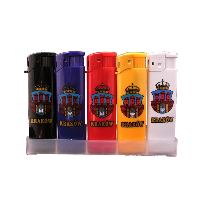 Zapalniczka gazowa piezoelektryczna do wielokrotnego napełniania z utrudnionym uruchamianiem dla dzieci. Ozdobiona nadrukiem prezentującym herb Krakowa.