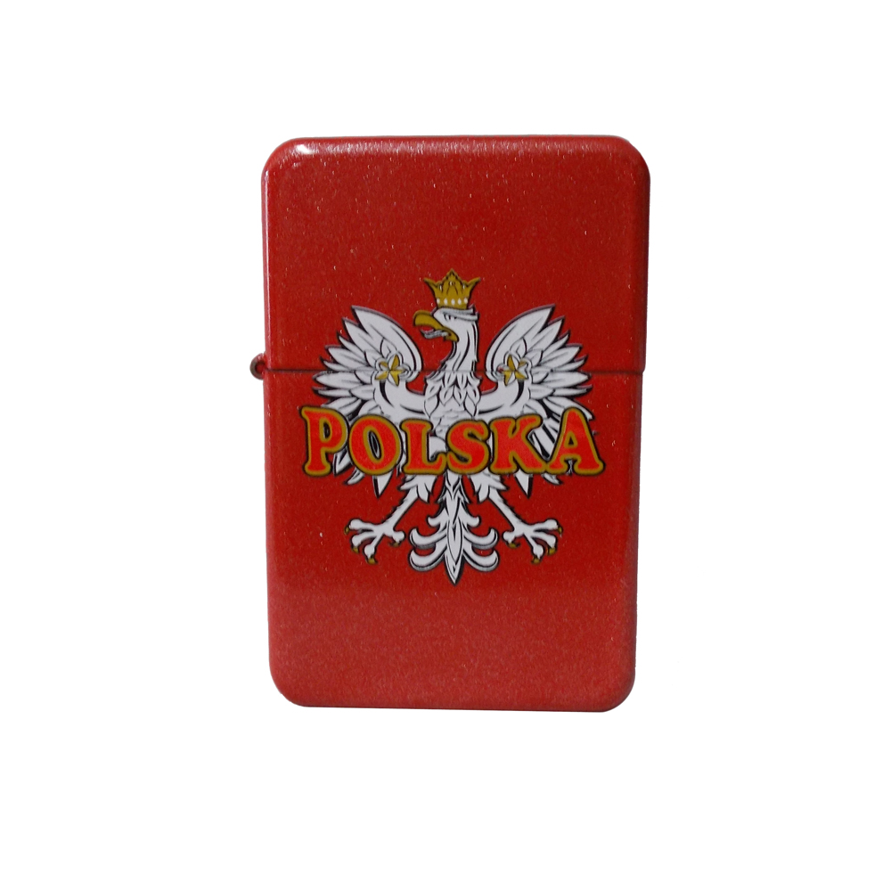 Czerwona, metalowa zapalniczka na benzynę, z ruchomym wieczkiem. Ozdobiona nadrukiem przedstawiającym napis Polska na tle orła.